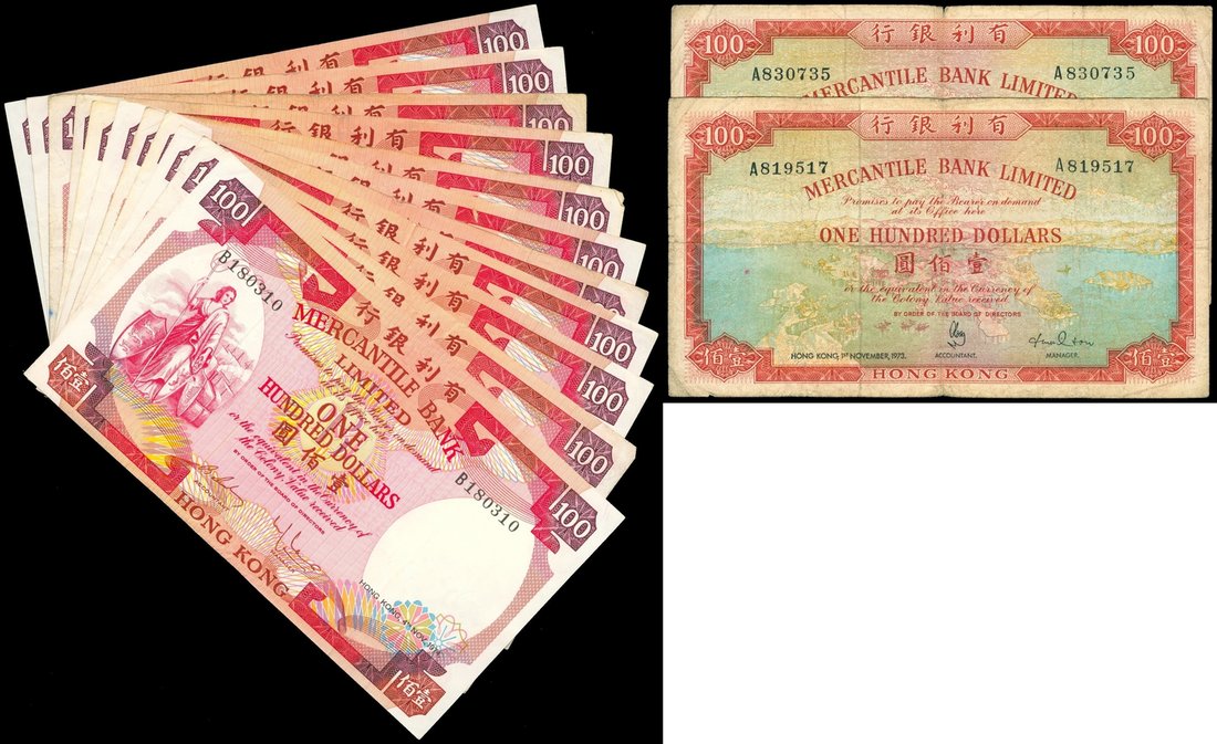 Hong Kong, Mercantile Bank Ltd., a group of 13x $100 notes, 1973 (2) 1974, prefix A-B with a range of suffixes, 1973 (2) and 1974 (11),