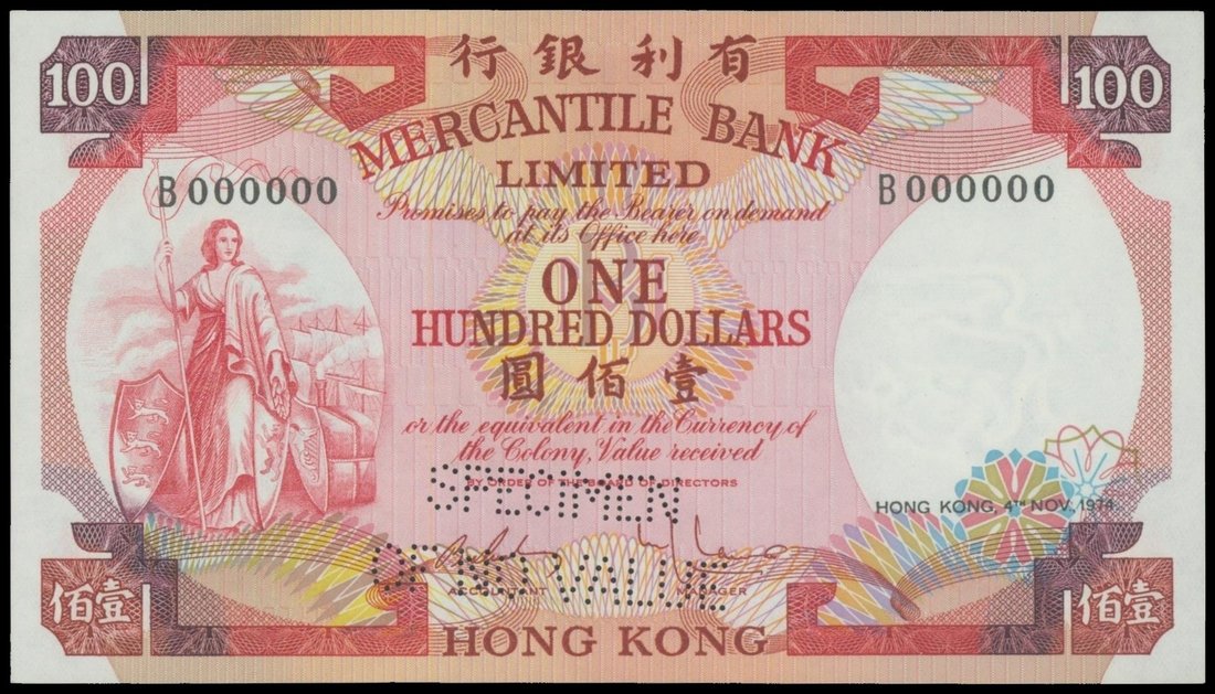 Mercantile Bank Limited, $100, specimen, 4.11.1974, serial number B000000, red and multicolour, Britannia holding a spear at left, reverse blue and red, view of Victoria Harbour, perforated 'SPECIMEN',