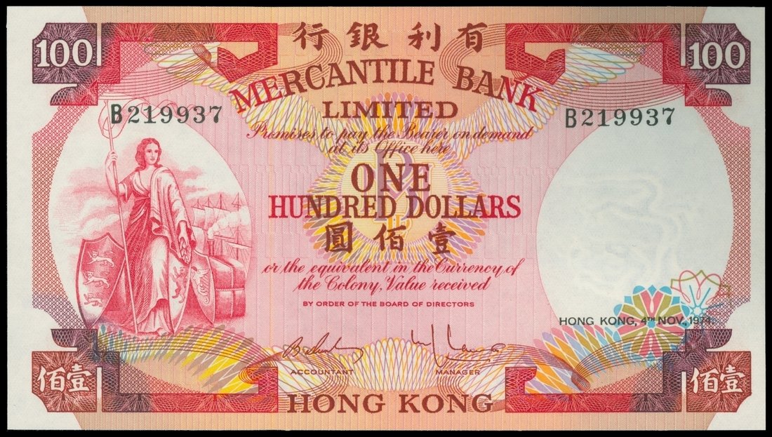 Mercantile Bank, $100, 4.11.1974, serial number B219937, red and multicolour, Britannia holding a spear at left, reverse blue and red, view of Victoria Harbour,