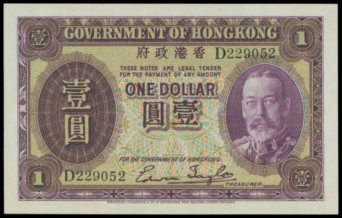 Government of Hong Kong, $1, no date (1935), serial number D229052, purple on yellow, King George V at right, reverse purple, denomination in Chinese and English text,