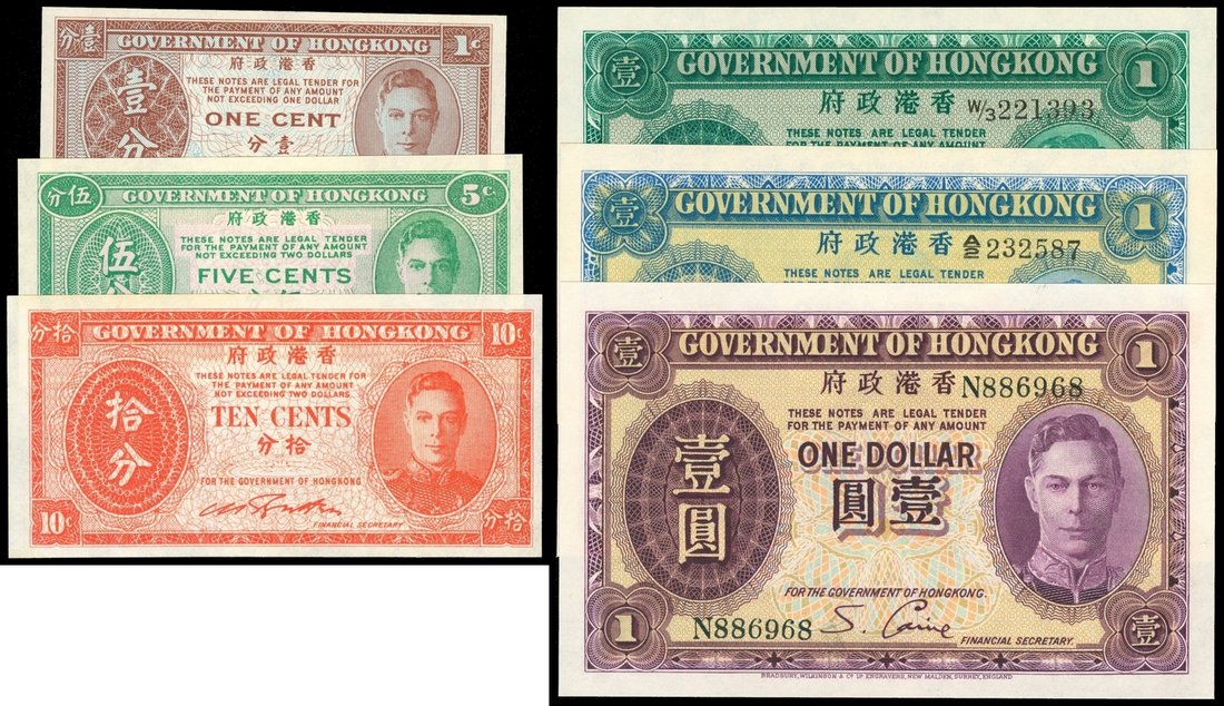 Hong Kong Government, group of 6 notes, 1, 5 and 10 cents, and $1, 1936, 1940 and 1949,