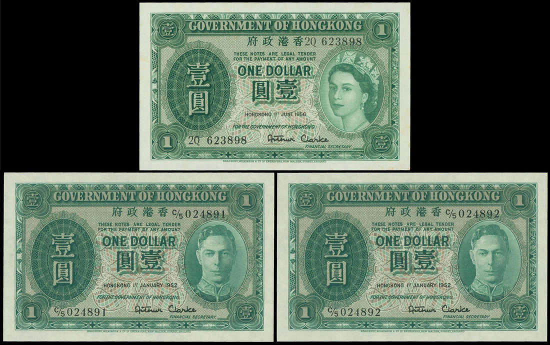 Government of Hong Kong, group of 3 $1, 1.1.1952 (2) and 1.6.1956, consecutive serial number C/5 024891, 024892 and 2Q 623898, dark green on multicolour underprint, King George VI and Queen Elizabeth II at right respectively,