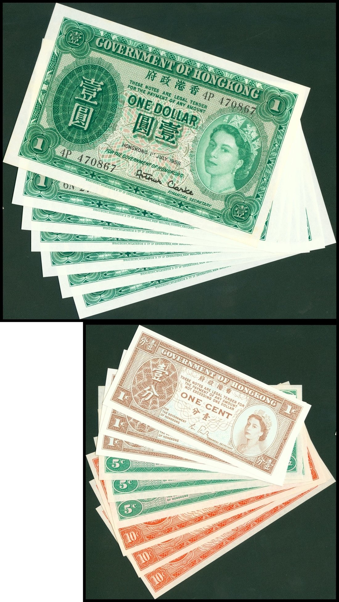 Hong Kong Government, group of 16 notes, all featuring Queen Elizabeth II, 1 cent (3), 5 cents (3), 10 cents (3), $1, 1958 (1) and 1959 (5)