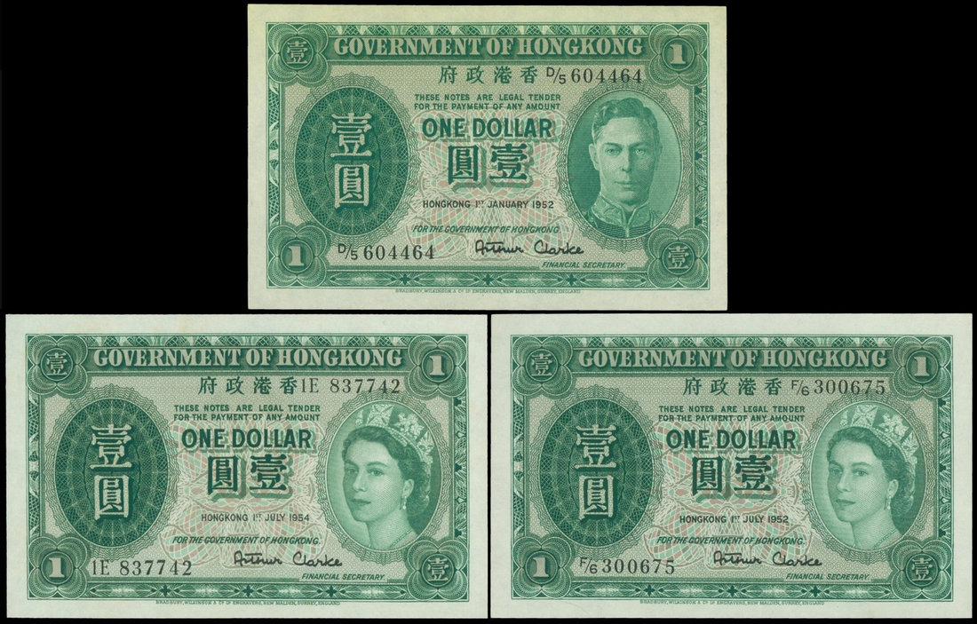 Government of Hong Kong, group of 3 $1, 1952-1954, serial numbers D/5 604464, F/6 300675 and 1E 837742, dark green on multicolour underprint, King George VI and Queen Elizabeth II at right respectively,