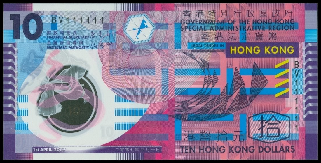 Government of Hong Kong, $10, 1.4.2007, solid serial number BV111111, polymer plastic, purple, blue and multicolour, geometric patterns,