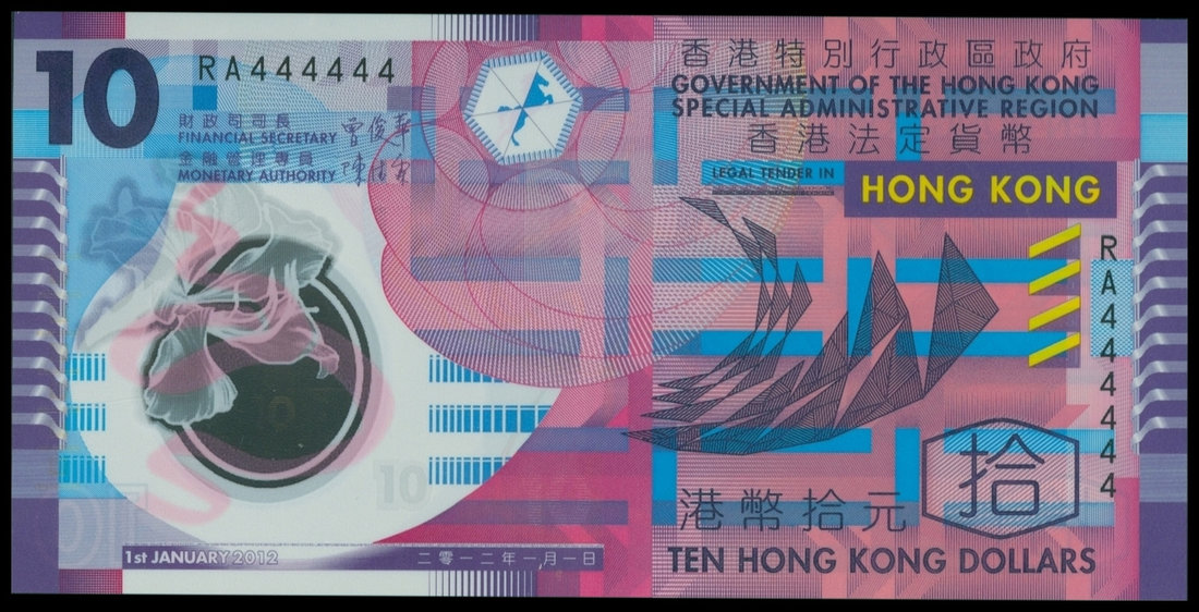 Hong Kong Government, $10, 1.1.2012, solid serial number RA444444, polymer plastic, purple, blue and multicolour, geometric patterns,