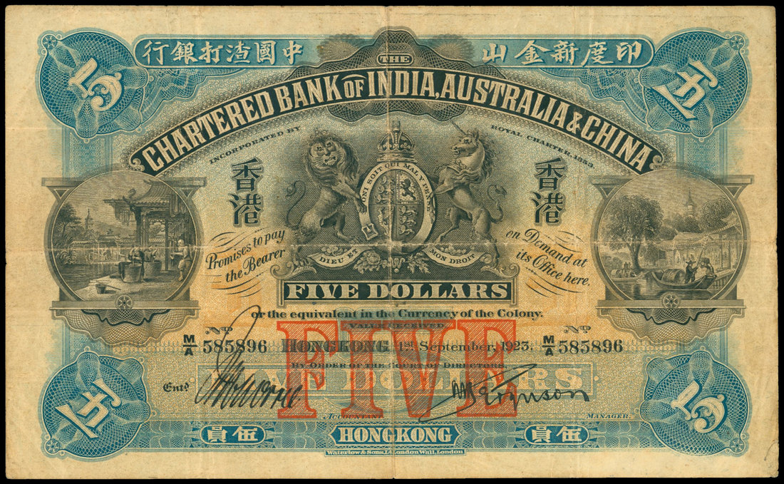 The Chartered Bank of India, Australia and China, $5, 1.9.1923, serial number M/A 585896, blue, black and orange, bank coat of arms at top centre, '5' at each corners, rice pounding scene at left, boatmen at right, 'FIVE: in red underprint at bottom centre, clear handsigned signatures, reverse red and black, bank building at centre,