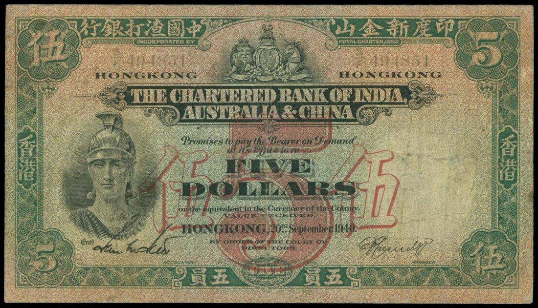 The Chartered Bank of India, Australia & China, $5, 20th September 1940, serial number S/F494851, black and green on red underprint, helmeted warrior at left, arms at top centre, reverse green, junk at centre, handsigned signature at low left,