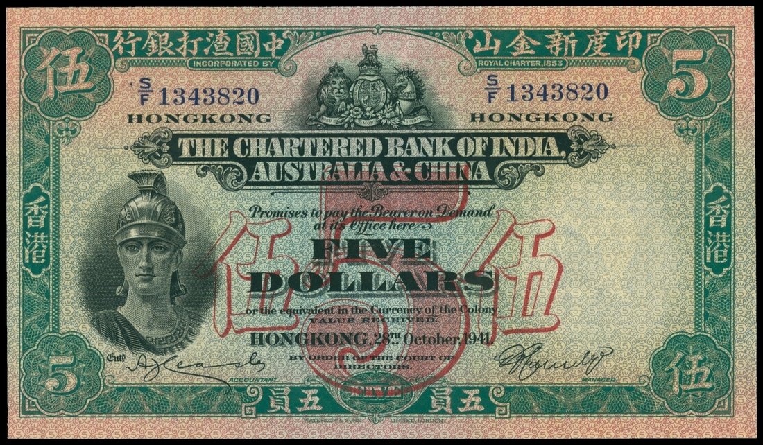 Bank of India, Australia & China, $5, 28.10.1941, serial number S/F 1343820, green, black and red, Roman warrior at bottom left, large red ‘5’ at centre with Chinese characters, reverse green, junk boat and sampan right of centre,