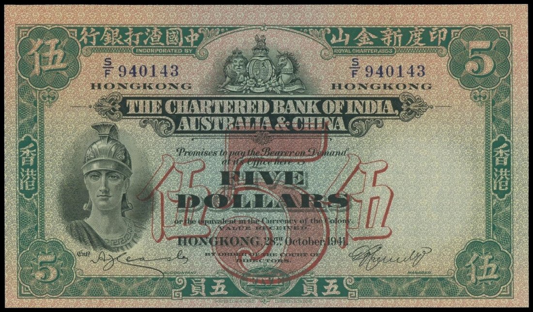 The Chartered Bank of India, Australia and China, $5, 28.10.1941, serial number S/F 940143, green, black and red, helmeted Roman soldier at left, bank coat of arms top centre, reverse green, sailing junk and sampans at centre,