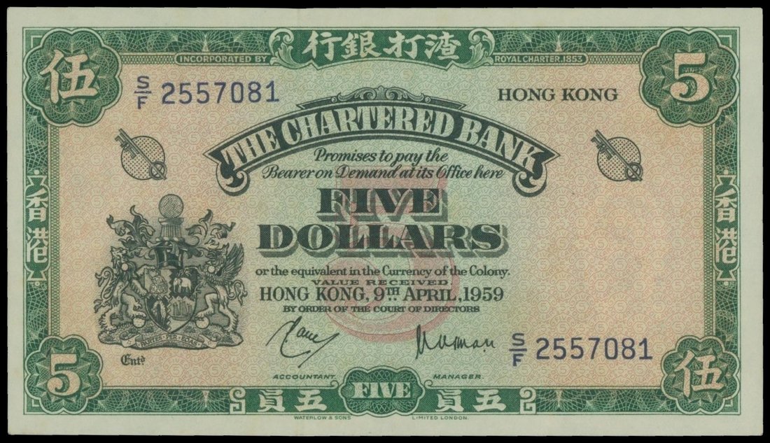 The Chartered Bank, $5, 9.4.1959, serial number S/F 2557081, green and multicoloured, keys left and right, coat of arms at left, reverse green, sampan at centre,