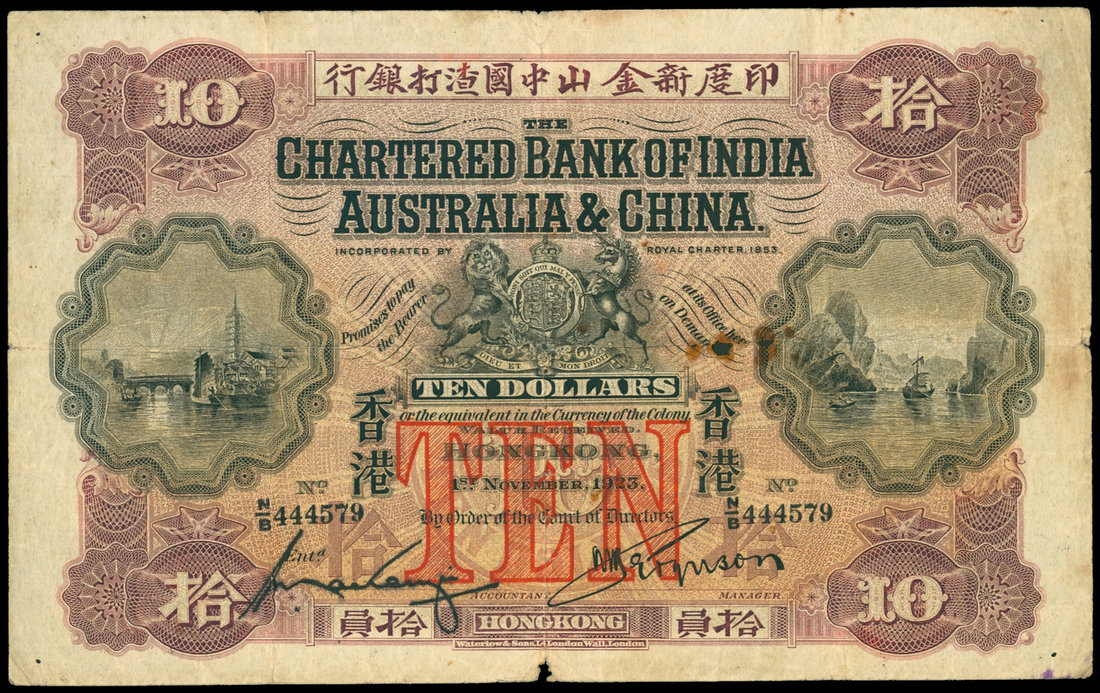The Chartered Bank of India, Australia and China, $10, 1.11.1923, serial number N/B 444579, purple, black and orange, bank coat of arms at centre, riverside scenes left and right, 'TEN' as an underprint in red, reverse purple and black, the bank building at centre,