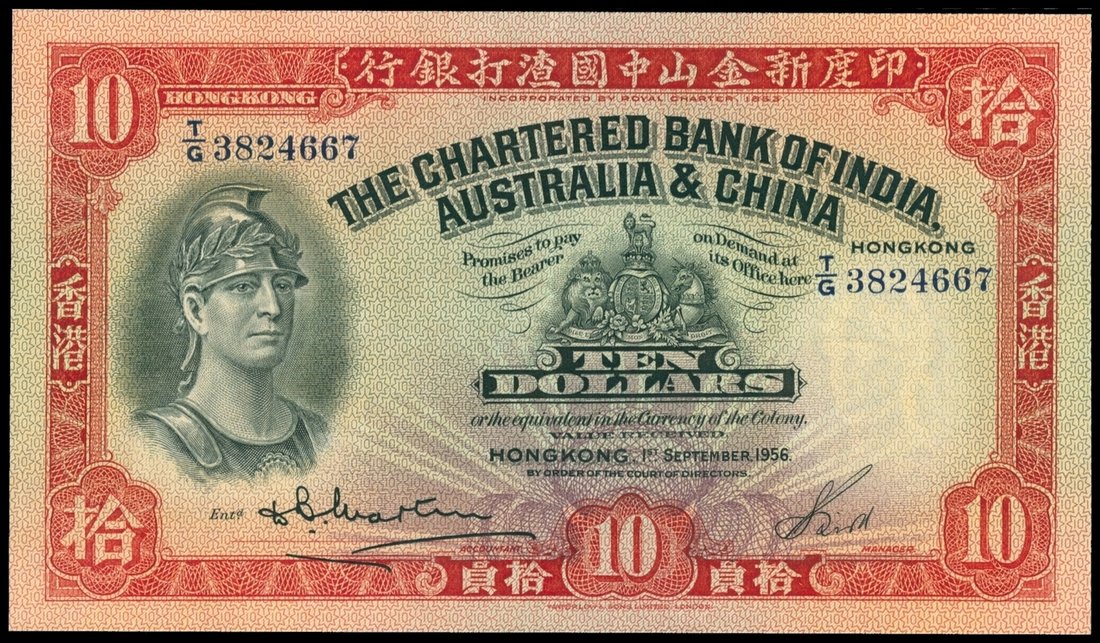 Bank of India, Australia & China, $10, 1.7.1956, serial number T/G 3824667, red, black and pale green, Roman soldier at left, bank coat of arms at centre, watermark area at right, reverse red and green, rice planting scene and pagoda at centre,