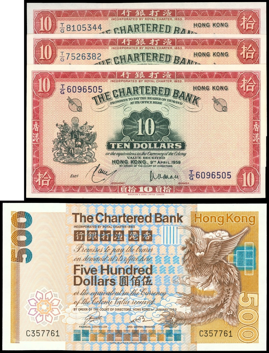 The Chartered Bank, group of 4 notes, $10 (3), 1959, 1961 and 1962, serial number T/G6096505, T/G7526382 and T/G8105344, $500, 1982, serial number C357761,