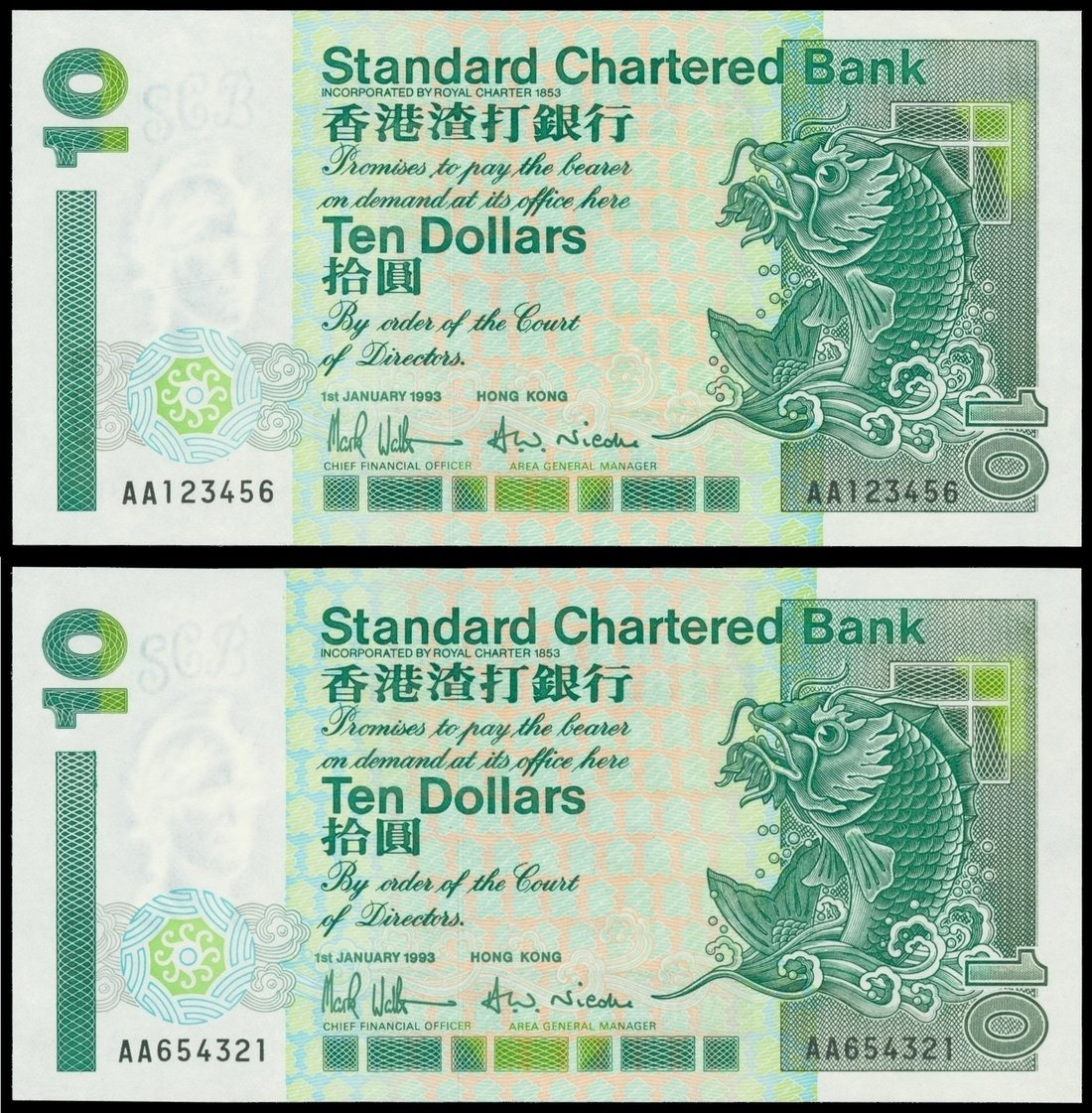 Standard Chartered Bank, pair of $10, 1.1.1993, serial numbers AA123456 and AA654321, ascending and decending ladder serial number, green and multicolour, mythical carp at right, watermark of a helmeted warrior at left,