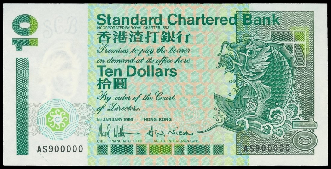 Standard Chartered Bank, $10, 1.1.1993, serial number AS900000, green and multicolour, mythical carp at right, watermark of a helmeted warrior at left,