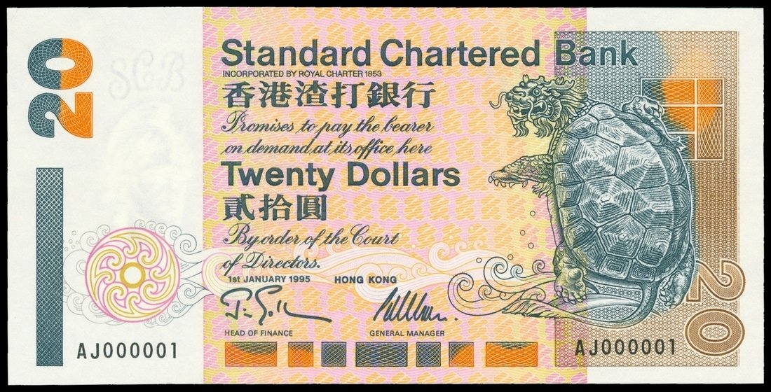 Standard Chartered Bank, $20, 1.1.1995, lucky serial number AJ000001, dark gray, orange and brown on multicolour underprint, mythological tortoise at right, reverse gray-blue on multicolour underprint, with minor printing error at centre,