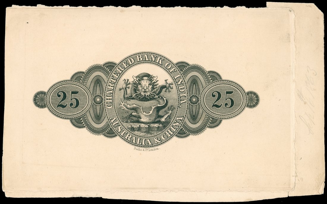 The Chartered Bank of India, China and Australia, $25, black and white die proof of an unissued reverse, handwritten 'Sep 16 1863', the same design featured on the $500, as shown in 'Coinage & Paper Money Hong Kong', dragon at centre, concentric circles left and right, '25' left and right, printed by Batho and Co, London. A similar reverse is seen on the $500 printed between 1879 and 1910 and therefore explains why PMG labels the date as being 1879-1910.