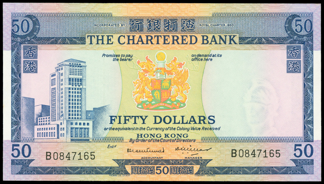 The Chartered Bank, $50, ND (1970), serial number B0847165, blue and multicoloured, coat of arms at centre, bank buidling at left, watermark of helmeted warrior at right, reverse blue, buildings at centre,