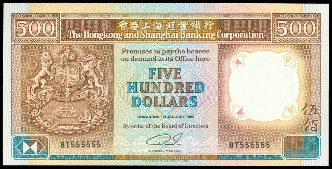 The HongKong and Shanghai Banking Corporation, $500, 1.1.1992, solid serial number BT555555, brown on multicolour underprint, arms at left, watermark at right, reverswe brown and light blue, lions flanking bank building at centre,