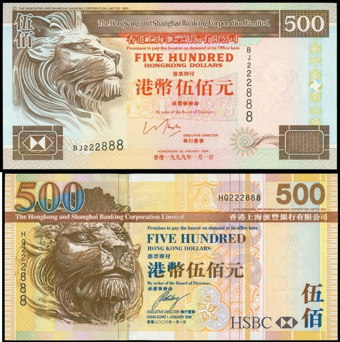The HongKong and Shanghai Banking Corporation, a pair of $500, 1.1.1999 and 1.1.2008, serial numbr BJ222888 and HQ222888, brown on multicolour underprint, lion at left, watemark at right,