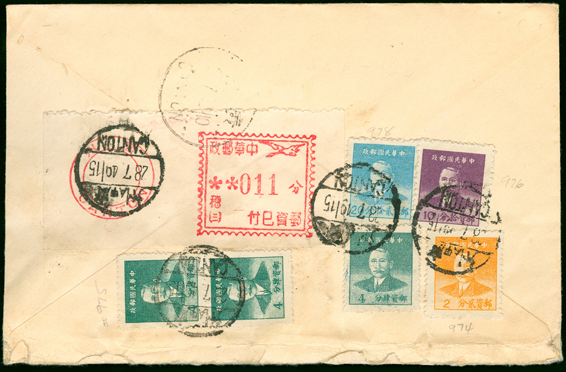 1949 (28 Jul.) Canton Silver Yuan Postage Paid air mail cover to U.S.A., Bearing 44c. franking tied by Canton bilingual c.d.s. In addition a "China post postage paid" lable also tied by Canton bilingual c.d.s., It is unusual bearing stamps and postage paid lable together. fine