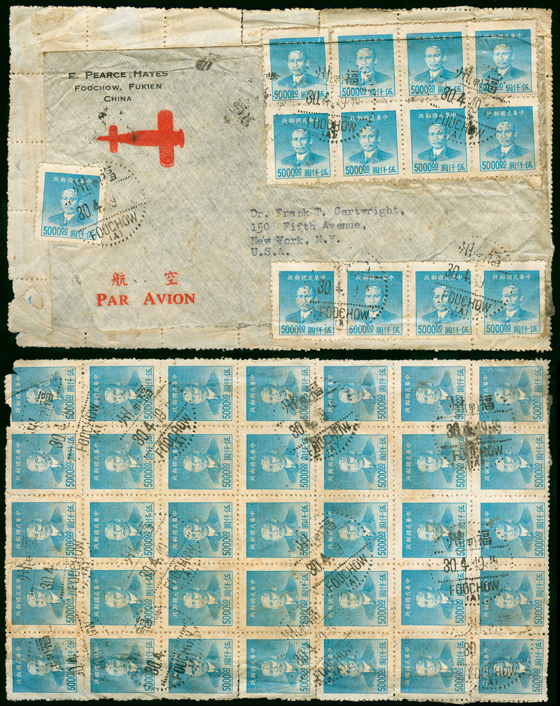 1949 (30 Apr.) Gold yuan airmail cover Foochow to U.S.A. franked with $5000 (48).