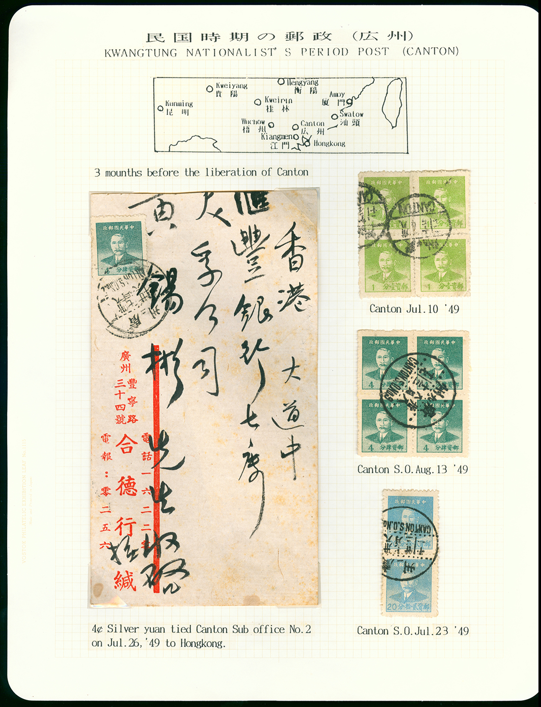1949 Huanan silver yuan used group of stamps, plus one cover (trimmed at top) with single 4c. Canton to Hong Kong.