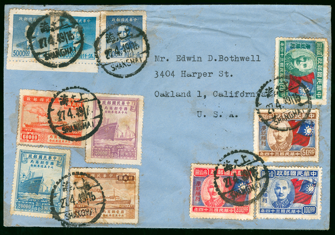 1949(27 Apr.) Shanghai to US cover with mixed frankings.