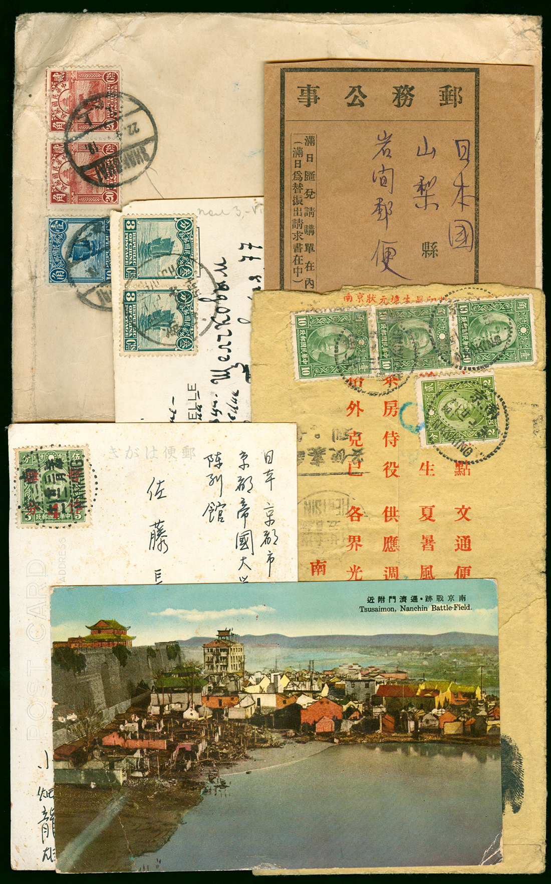 A small group of six covers and postcards at Republic Period, including a postcard showing Tsusaimon Nanking after Japanese army occupation, good to fine.