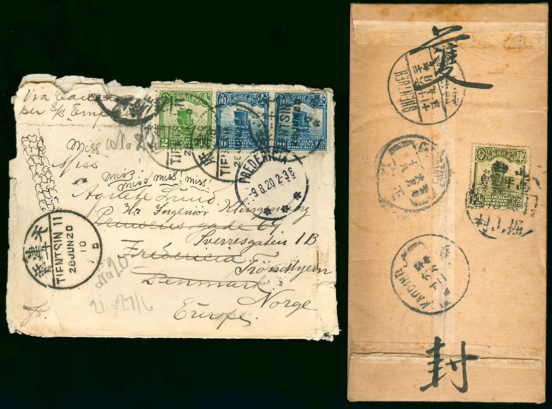 Two covers, 1/ 1931 (12 Jun.) Shansi to Hobei cover, bearing junk 4c. tied by Shansi letter box cancellation, and two transit c.d.s., Arrival Shentseh 1931 (19 Jun.)c.d.s.; 2/ 1920 (28 Jun.) Tientsin to Denmark than forward to Norge (Norway ) cover, bearing junk 22c franking, tied by Tientsin c.d.s. and transit Fredericia (9 Aug.), arrival Norge ( 12 Aug.) on the reverse.
