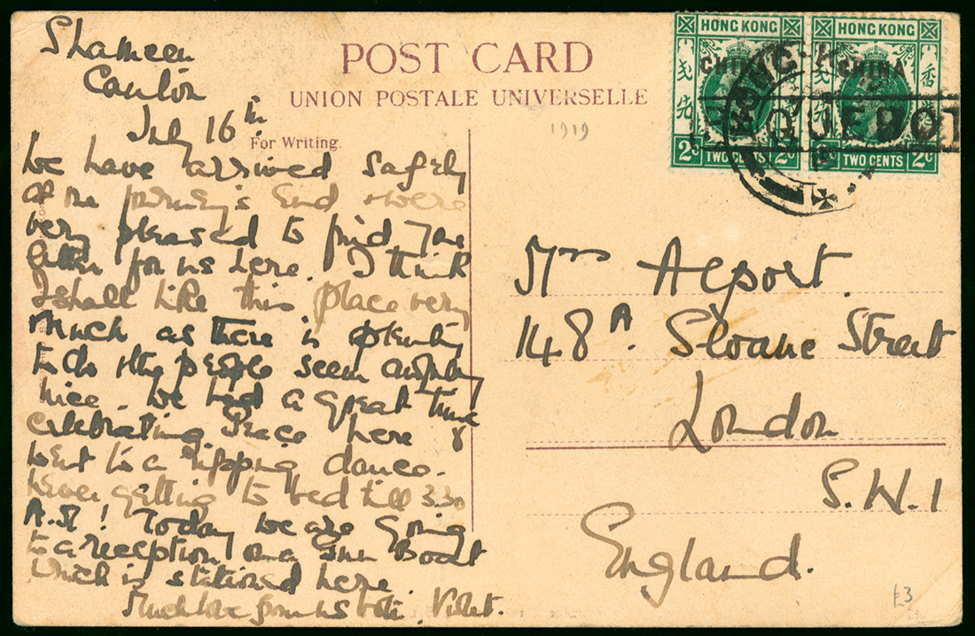 1919 (16 Jul.) picture postcard from Canton to England bearing K.G.V. overprint "CHINA", 2c. pair tied by Hong Kong (17 Jul.) c.d.s. and "PAQUEBOT" chop, very scarce