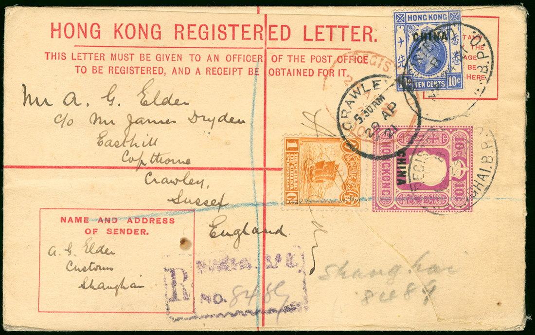 1921 (24 Mar.) K.G.V. overprintd "CHINA" registered envelope to England, added K.G.V. 10c. and China Junk 1c. tied by Shanghai registered c.d.s.