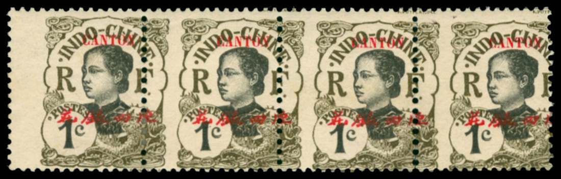 Canton: 1908 Native girl issue 1c. olive, horizontal strip of four ahowing variety perforation shifted to left mint. Chan FFC 50.