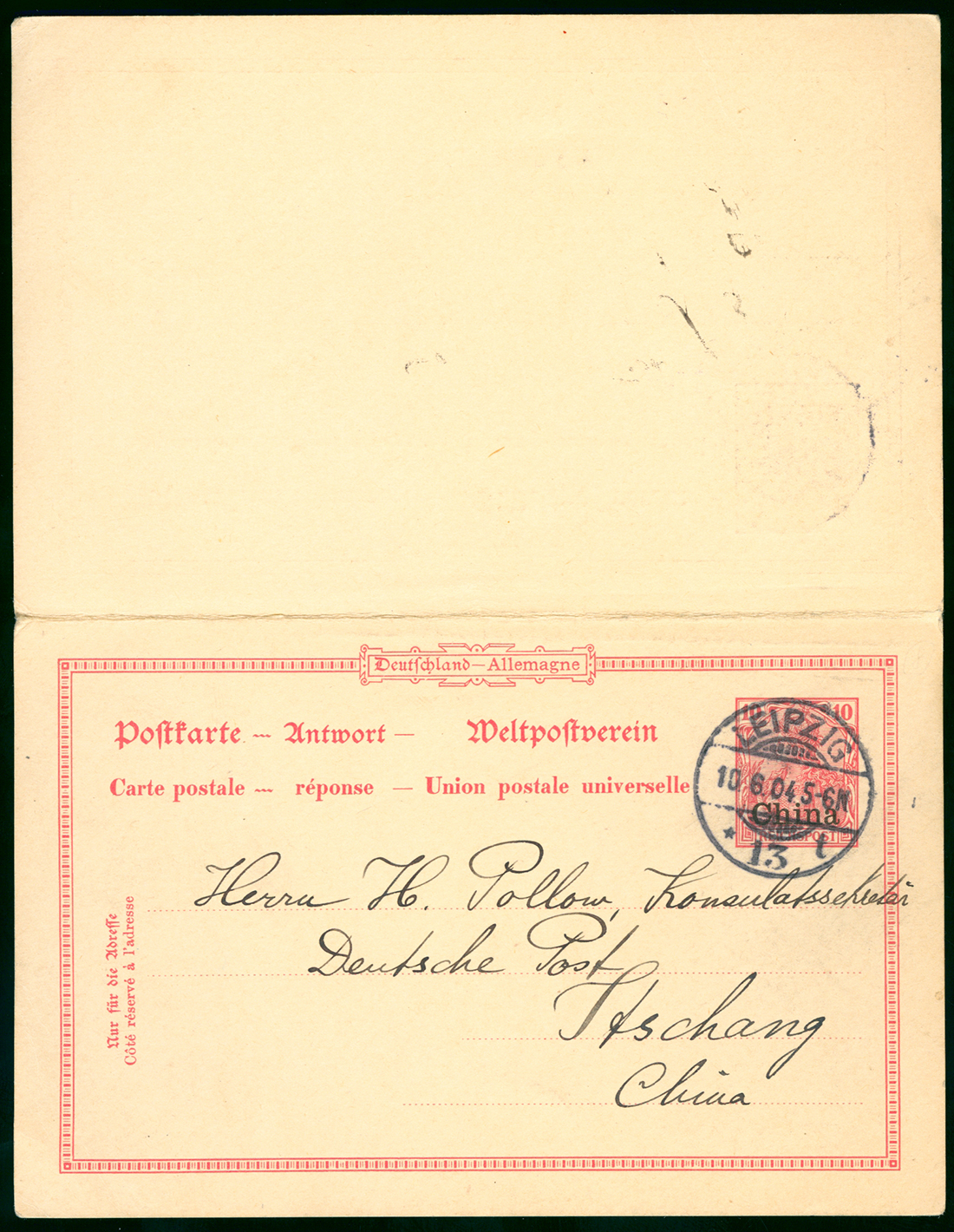 1904 (6 Feb) 10pf reply stationery card Shanghai to Leipzig to Ichang, used. Scarce.