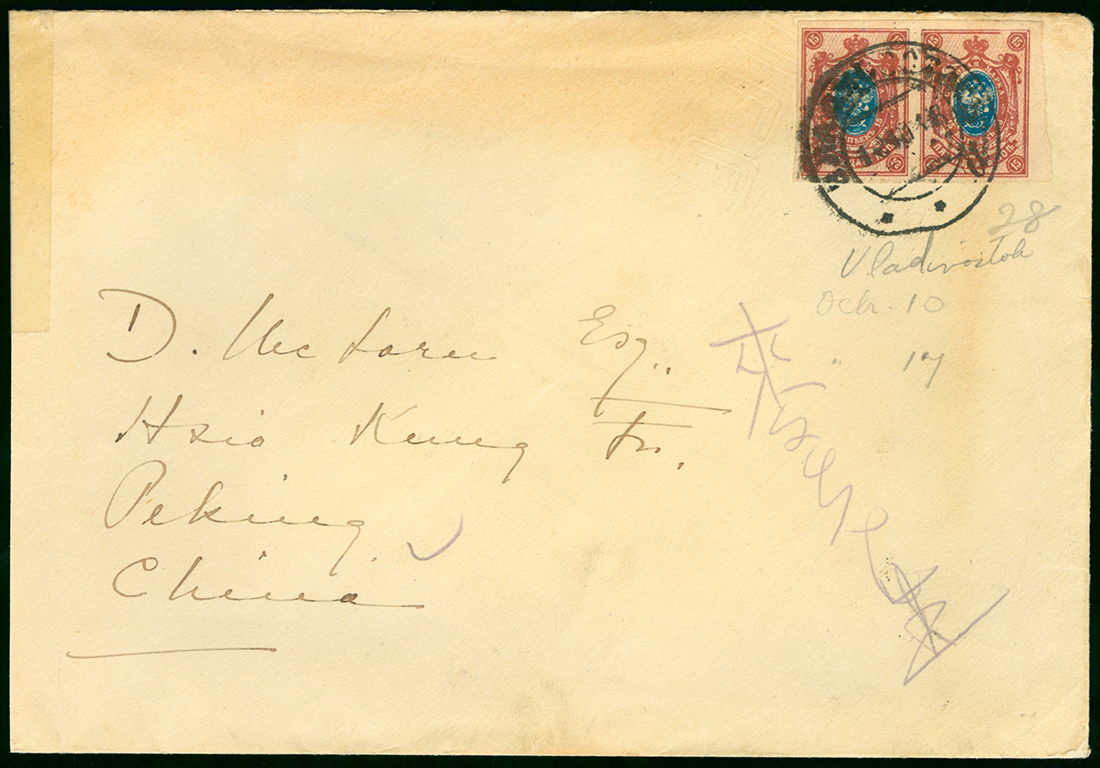 1918 (1 Oct) cover from Vladiroska to Peking bearing 15K imperf. pair Peking (17 Oct) arrival c.d.s..