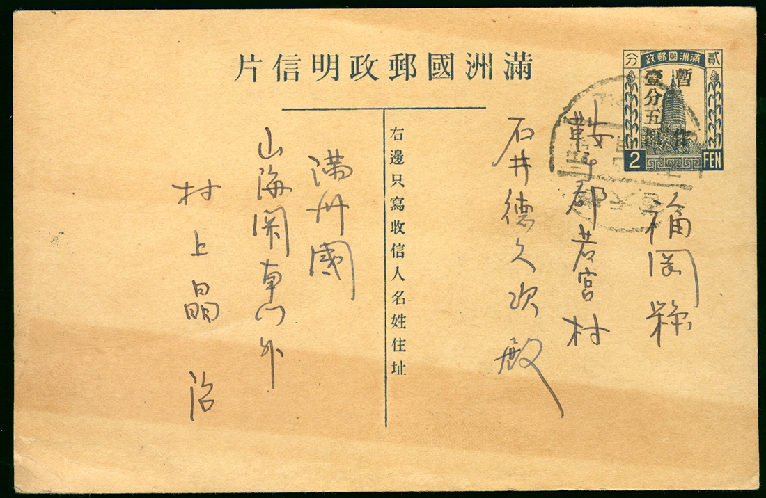 1934 (19 Apr) stationery postcard surcharged 1 ½c. on 2c. tied by Shanhaikwan to Japan.