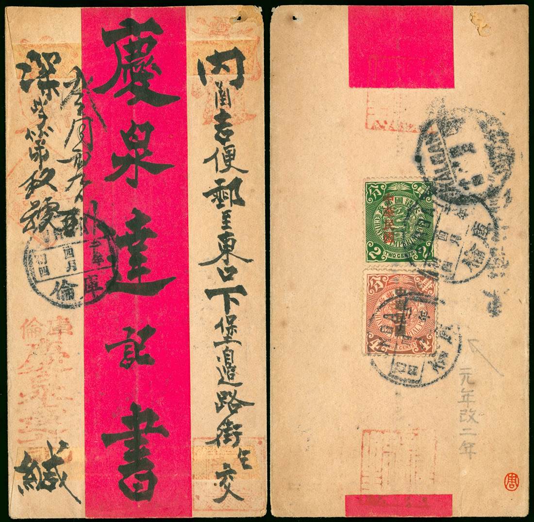 1913 (4 Apr.) red band envelope to Kalgan (Changkiakow) bearing, on the reverse, R.O.C. overprint 2c. and 4c. tied by Urga bilingual c.d.s. The year in Urga c.d.s. had been change from year one to year two and is scarce.