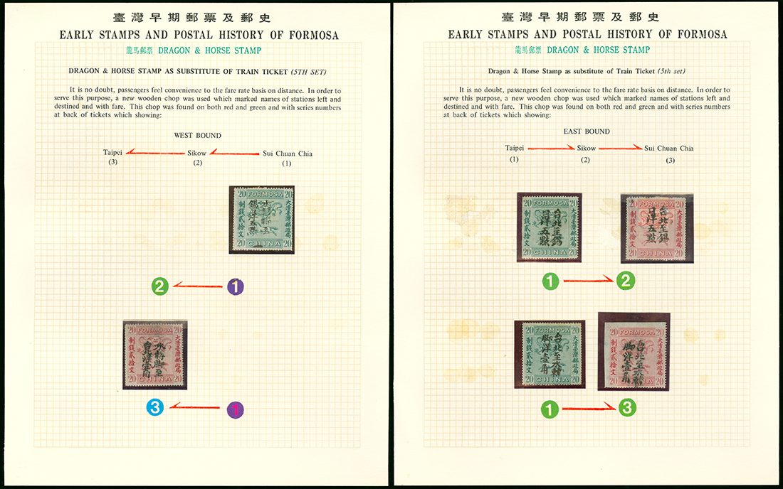 1888 a collection of early stamps and postal history with Formosa Dragon & Horse stamp, three pages with 20 cash Horse & Dragon stamps (green 6, red 6 ); two stamps used as substitute for train ticket, "Sui Chuan Chai to Sikow" (green) or "Sui Chuan Chai to Taipei" (red); four stamps as substitute of train ticket, "Taipri to Sikow" (green and red) and "Taipei to Sui Chuan Chia" (green and red); others with eight stamps, two red stamps with hand writing "Sikow or Sui Fen Chia", two red stamps handstamped "Taipei to Sikow" resurcharged in red "Sikow 5c.", two green stamps handstamped "Taipei to Sui Chuan Chia" resurcharged in red "Sui Fen Chia 10c.", another two stamps are one 20 cash red and one 20 cash green. No any handstamp or hand writing on them. rear, very fine and fresh.