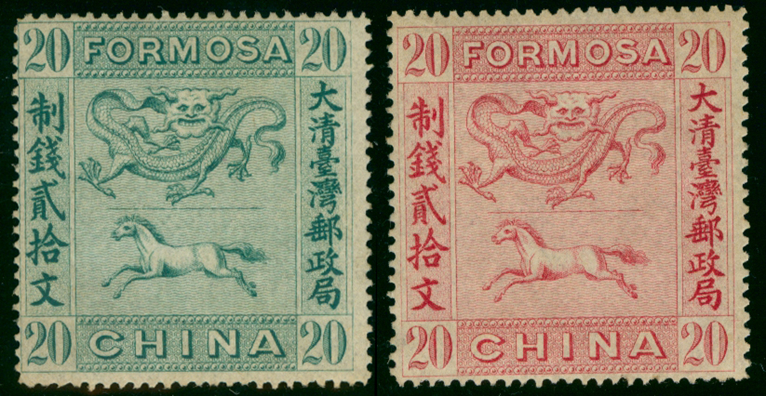 1888 Horse and Dragon 20 cash green and red. Unmounted mint with original gum. Very scarce in pair. Chan F15-F16.