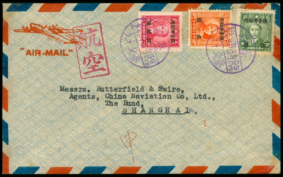 1946 Taiwan airmail cover to Shanghai bearing overprinted issues tied with a special purple "Temporary Post Office"cancellation
