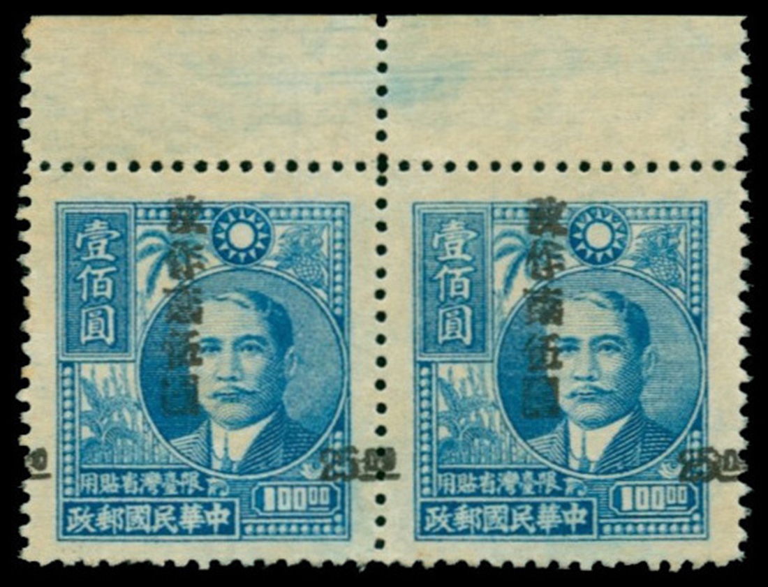 1948 Dr. Sun Yat Sen and Farm Products, surcharged by Ye Yuan Printing Co. Taipei, $25 on $100 pair with top margin, unused; with variety surcharge shifted to right. Chan TP77h.