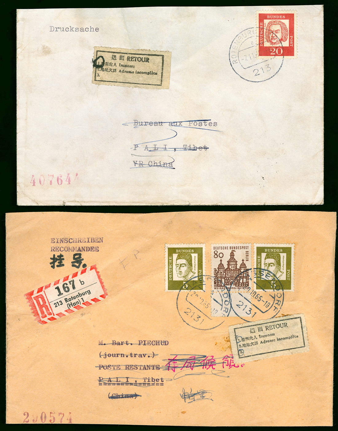 1965-7 Two Germany income cover to Pali, Tibet, both returned to sender.