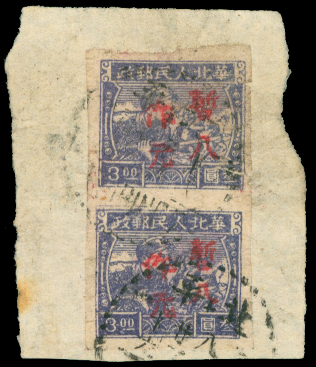 1949 Taiyue surcharge on Shih-Kia-Chwang print, by wood-chop $8 on $3 vertical pair on piece, very rare. Yang LNC6.