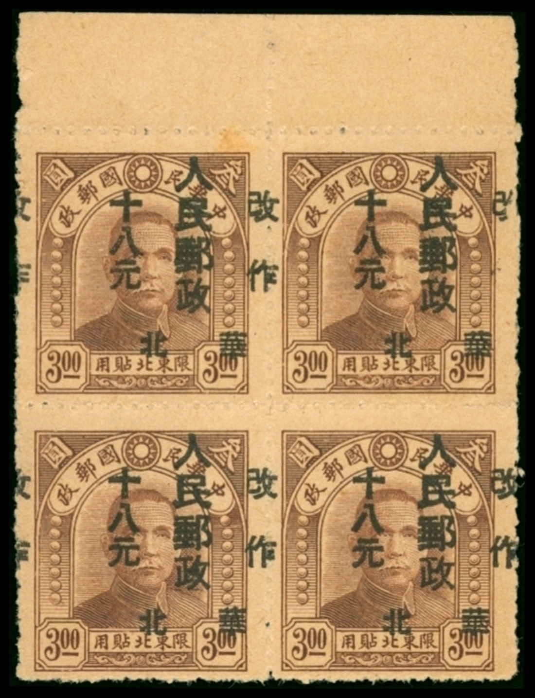 People's Post: 1949 Peking surcharge on Sun Yat Sen $18 on $3, brown, block of four with top margin.showing the variety surcharge shifted to the right and over the edge of the stamp with Chinese character "Gai" "Zuo" appear on both sides. Yang NC339b.
