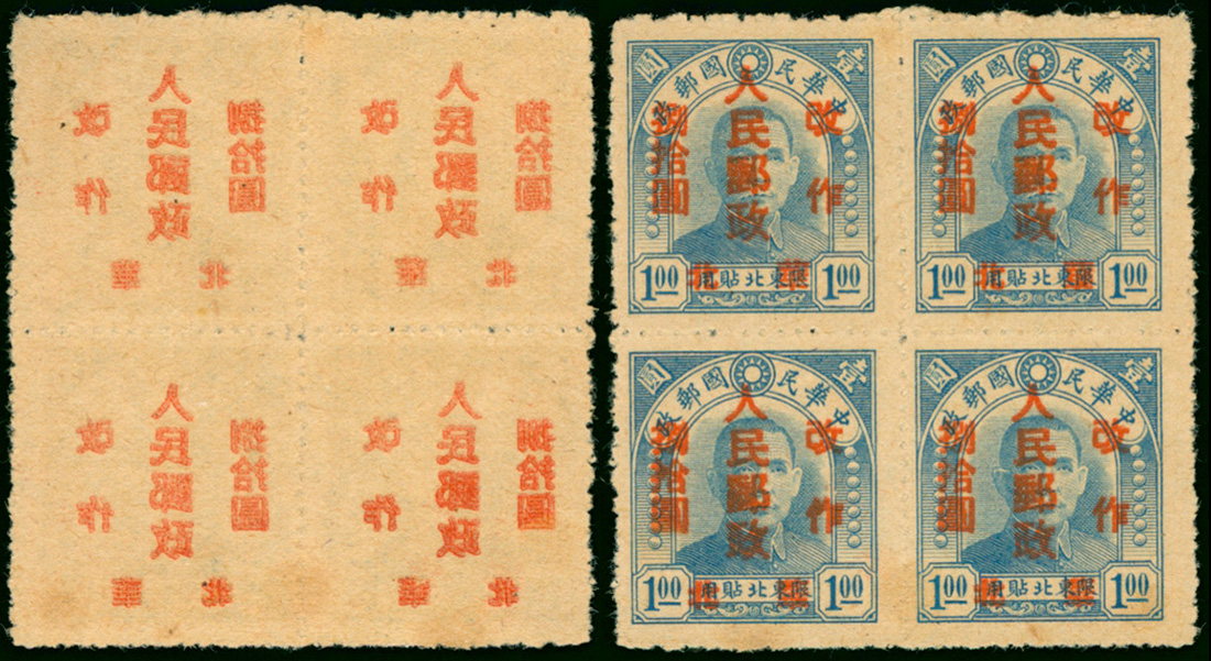People's Post: 1949 Peking surcharge in red on Sun Yat Sen $80 on $1 blue, block of four,all with variety surcharge wholly offset on the back. Yang NC349 var.