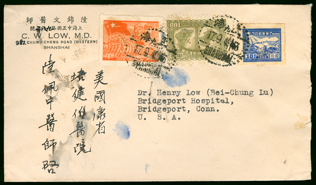 1949 (17 Sep.) Shanghai to U.S.A. cover, bearing East China Liberated Area stamps $ 180. franking, tied by Shanghai bilingual c.d.s.