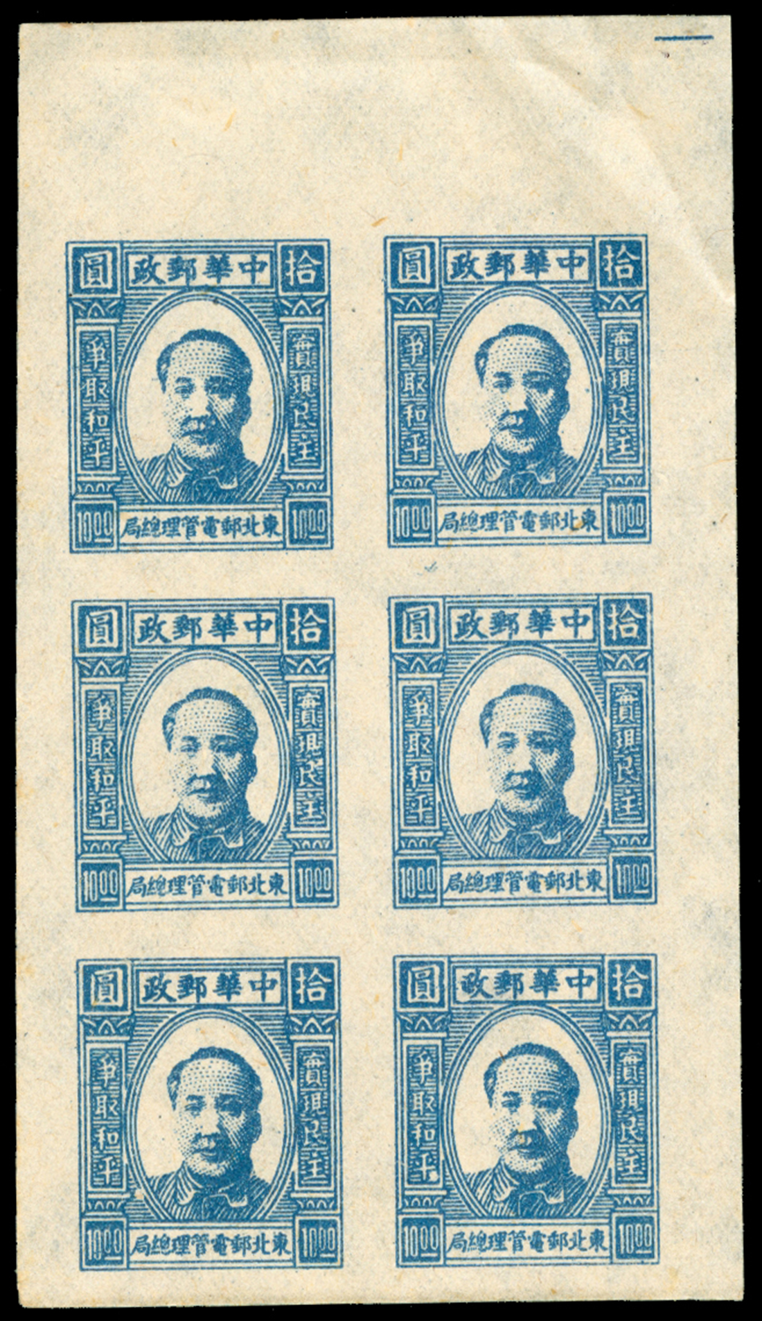 1946 1st Print Mao Zedong Issue, A group (10 sheet) of $10. block of six, blue, new, imperforated, with wide upper margin,