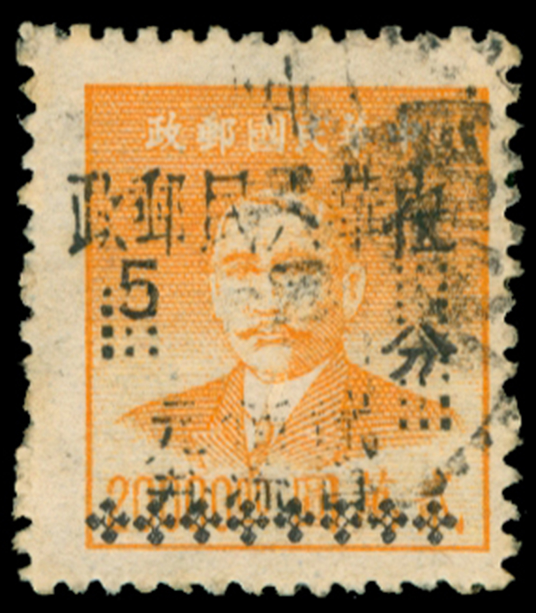 1949 Tie-Liu-Tsing hand overprint with 'People's Post and new value on Dr. Sun Yat-sen Chuingking, silver Yuan surcharge $200 on $20000, very fine used, scarce. Yang LSW25.