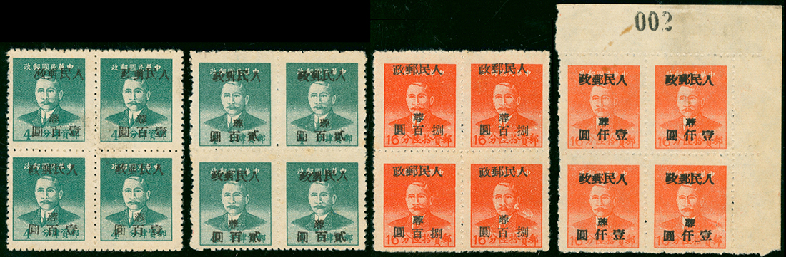1950 Chengtu surcharge with 'People's Post' and new value on Dr. Sun Yat-sen Silver Yuan issue, four values, Block of 4, one with sheet number, unused. Yang SW 45-47, 49.